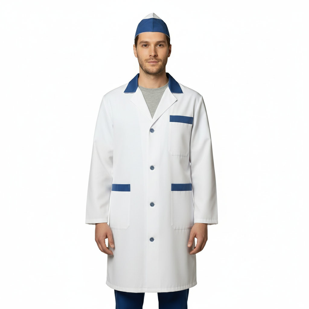 Uniforme professionale da uomo per il settore retail e alimentare, realizzata interamente in Italia. Questo camice elegante combina funzionalità e stile con profili colorati che ne caratterizzano i bordi, tre tasche strategicamente posizionate per praticità e chiusura centrale con bottoni. Resistente ai lavaggi frequenti a 30°C e facilmente stirabile, rappresenta la soluzione ideale per chi opera in supermercati, salumerie e laboratori. Disponibile per personalizzazione mediante stampa o ricamo del vostro logo aziendale.