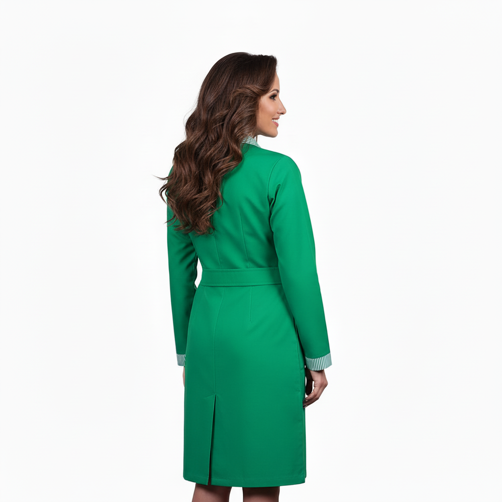 Camice professionale da donna con maniche lunghe, perfetto per ambienti che richiedono eleganza e praticità. Adatto a settori quali ristorazione, bellezza e sanità, questo capo rappresenta la scelta ideale per divise aziendali in strutture ricettive, servizi di pulizia e ospitalità. La linea raffinata e il colore verde conferiscono un aspetto curato e professionale, garantendo comfort durante le lunghe giornate lavorative.